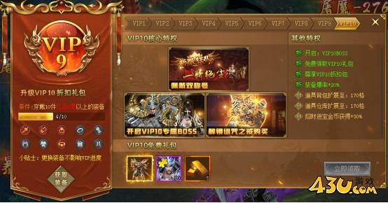 ● 游戏内穿戴指定品质整套(10件)装备即可升级VIP