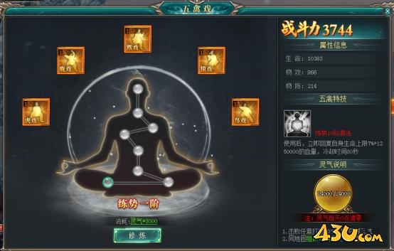 ● 提升至一定结束可激活/升级五禽戏技能,主动使用可瞬间恢复自身血量